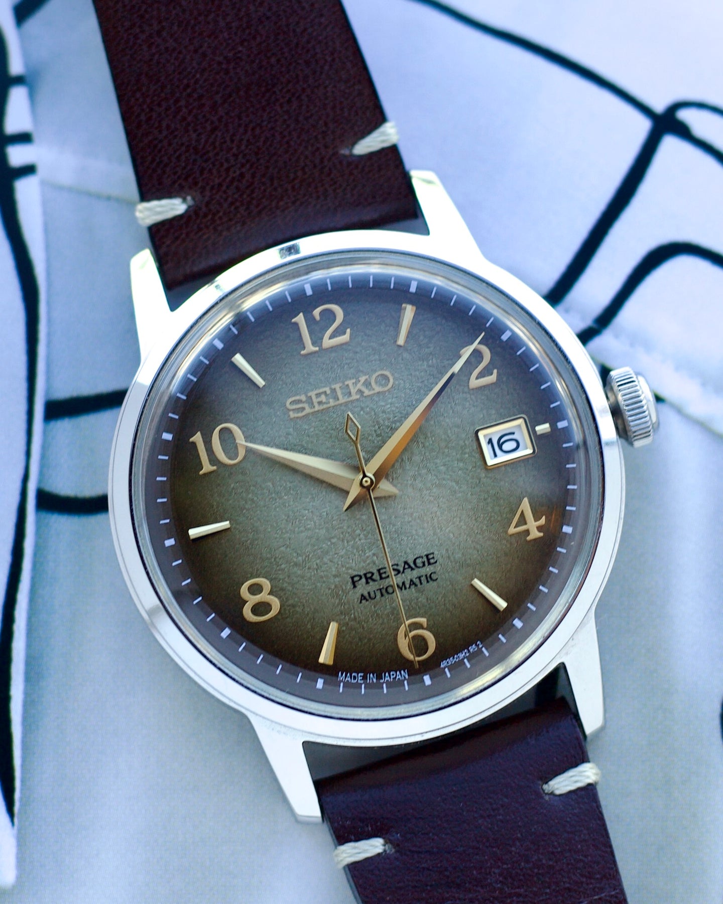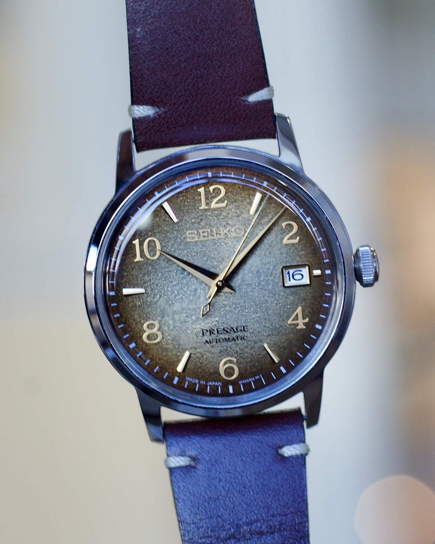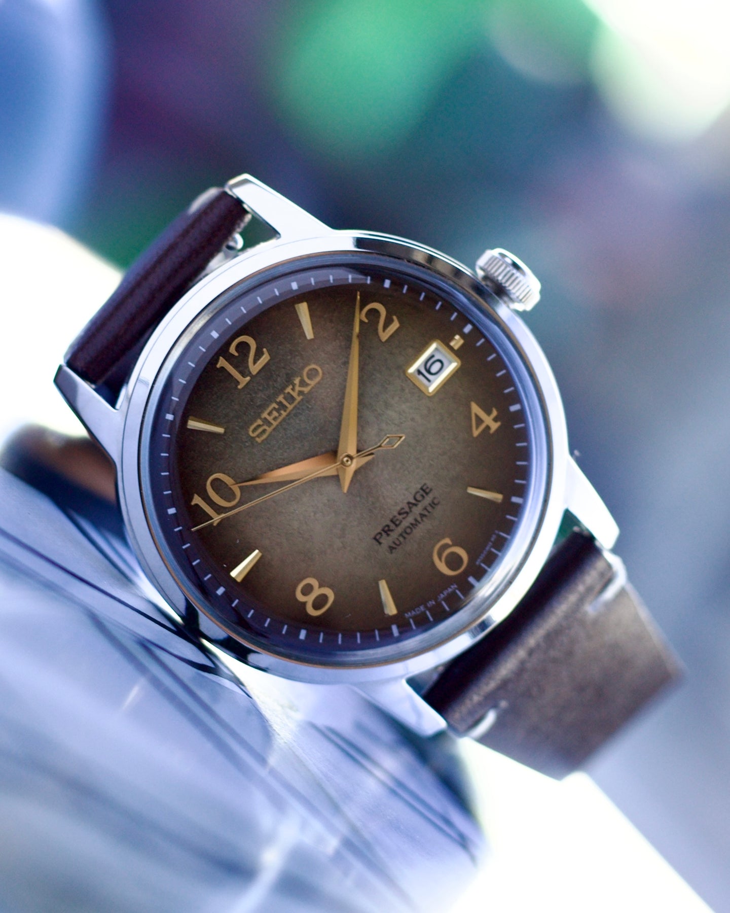 features a beautiful brown dial with gold-colored details. The color is inspired by the Hojicha cocktail with its smoky color of roasted green tea. The texture of the dial is designed to echo the traditional green tea ingredients from the Kyoto area.