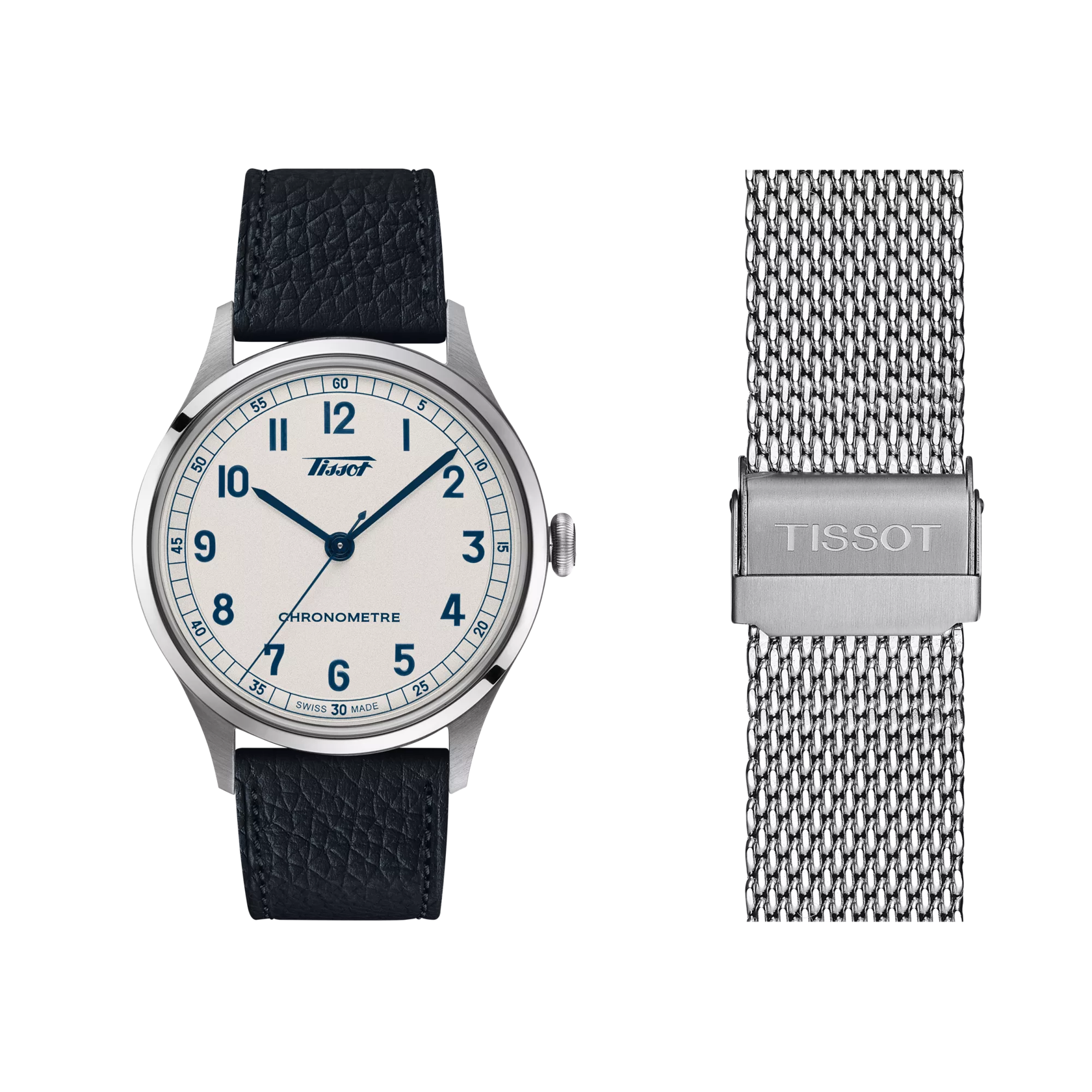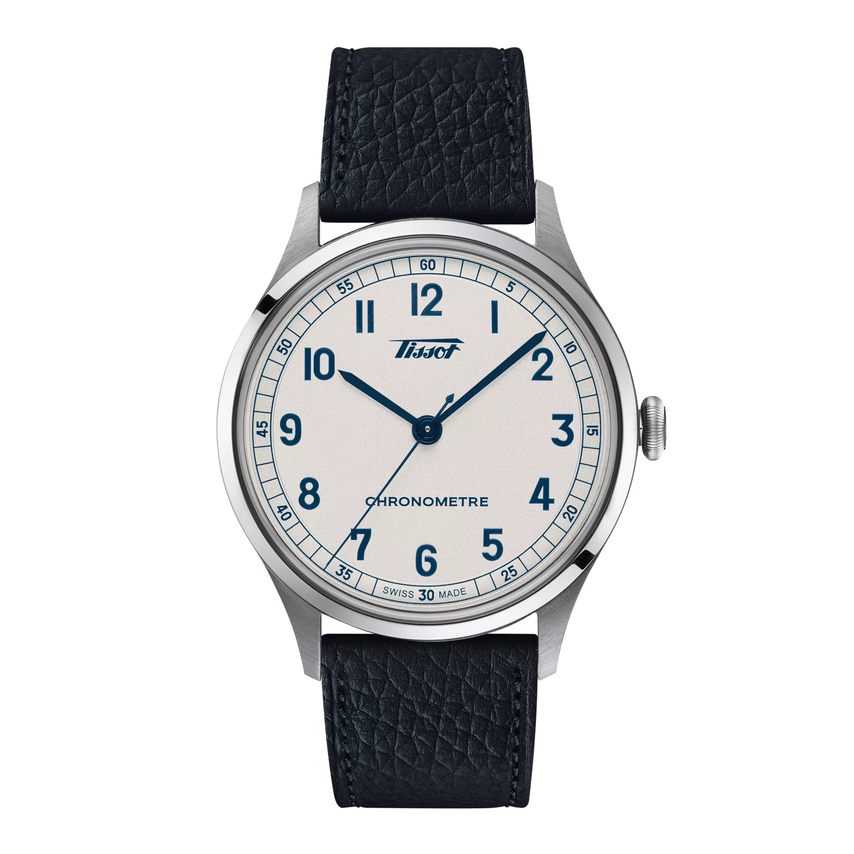 Tissot Heritage Gent Auto COSC 1938. Its vintage silver dial and contrasting dark blue Arabic numerals, were imagined as a nod to the simplicity and distinct design of the past. Protected by a 316L stainless steel casing and offering water resistance up to 50m, this timepiece is a durable partner for everyday life. The COSC-certified 2824-2 movement guarantees consistent accuracy, while the classic dark blue grained leather strap offers both comfort and style. Sized at 39mm, this watch is a refined choice for aficionados of craftsmanship and history.