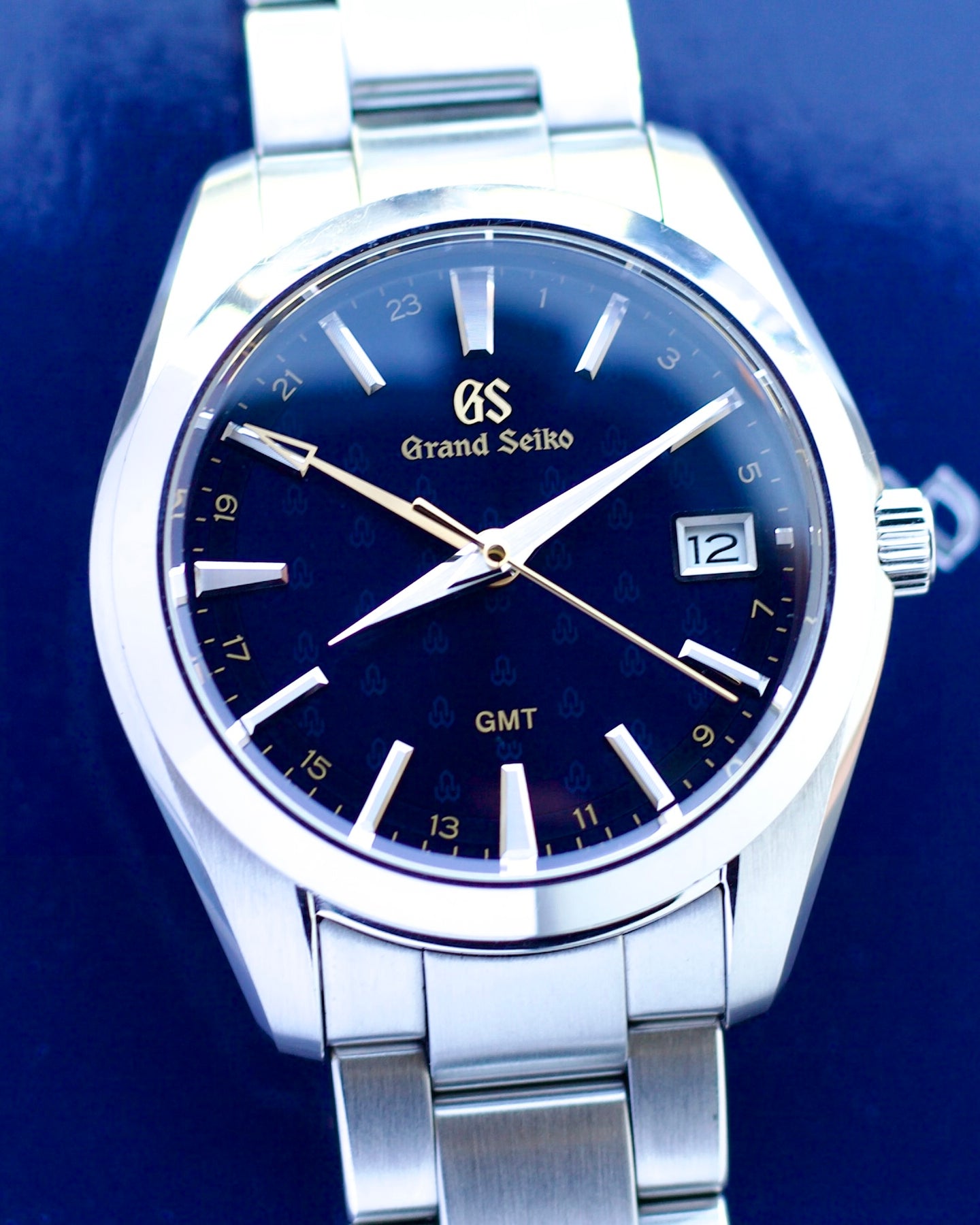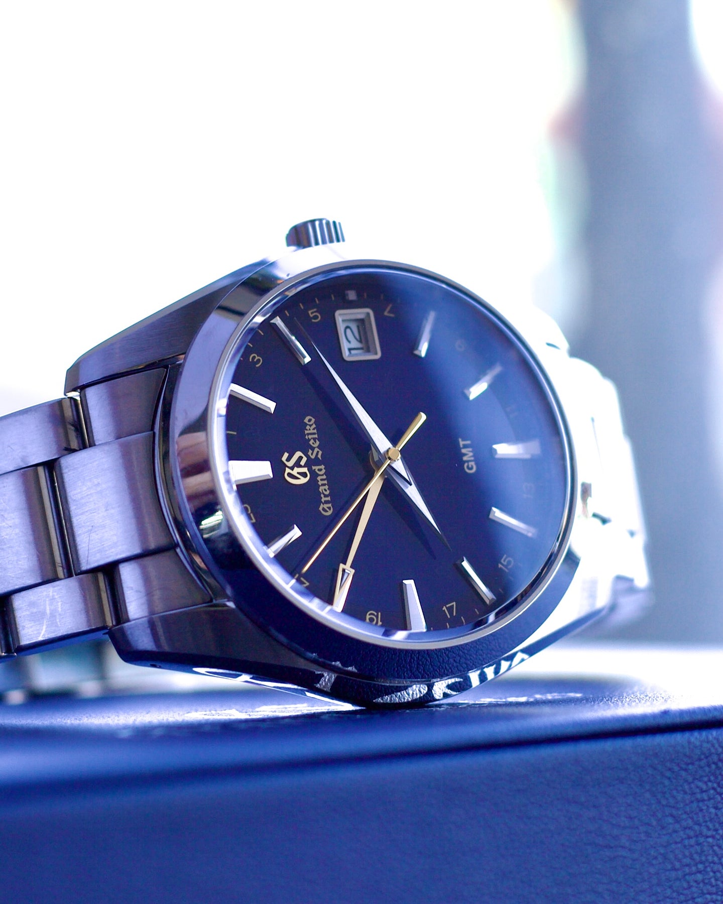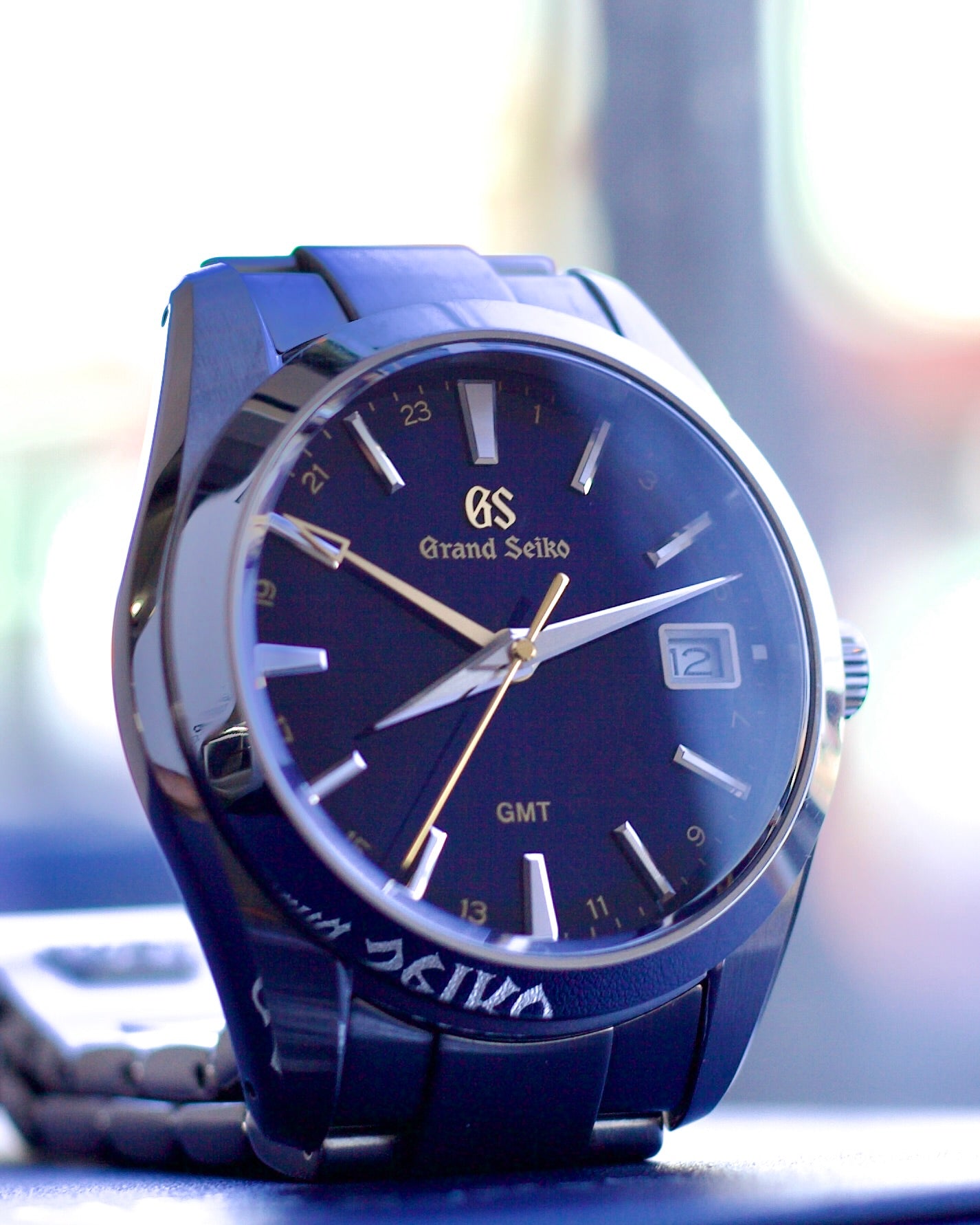 The seconds and GMT hands are in gold, as are the 24 hour numerals inside the minute track and the name Grand Seiko.
