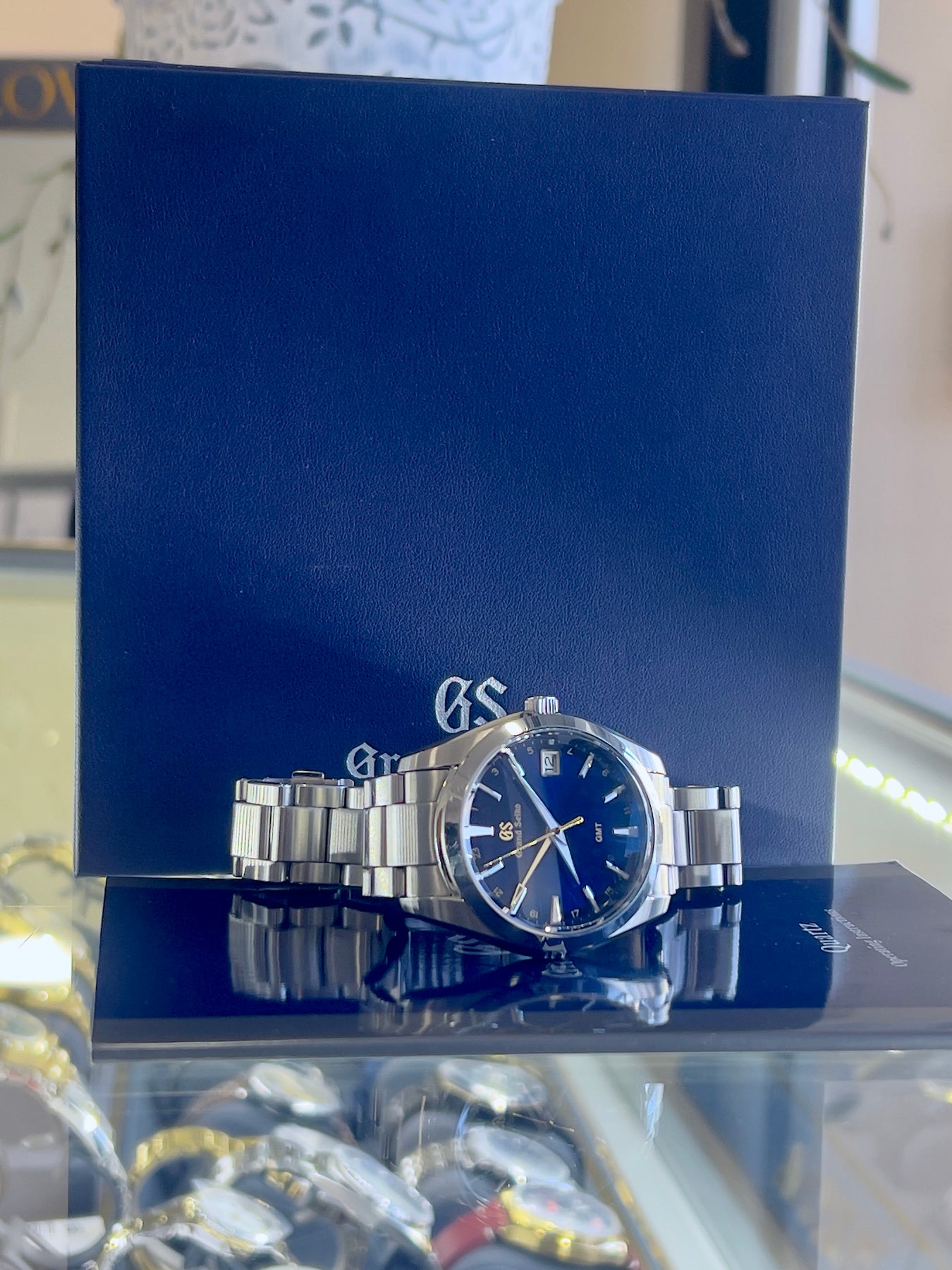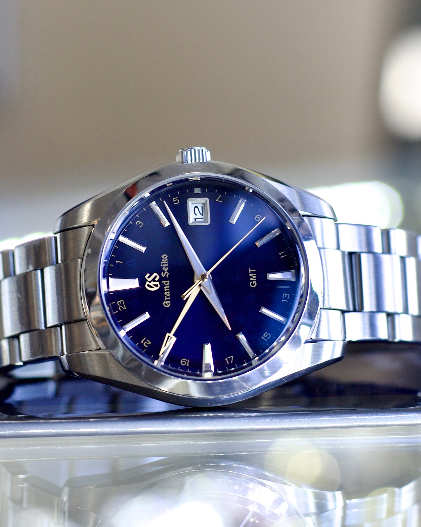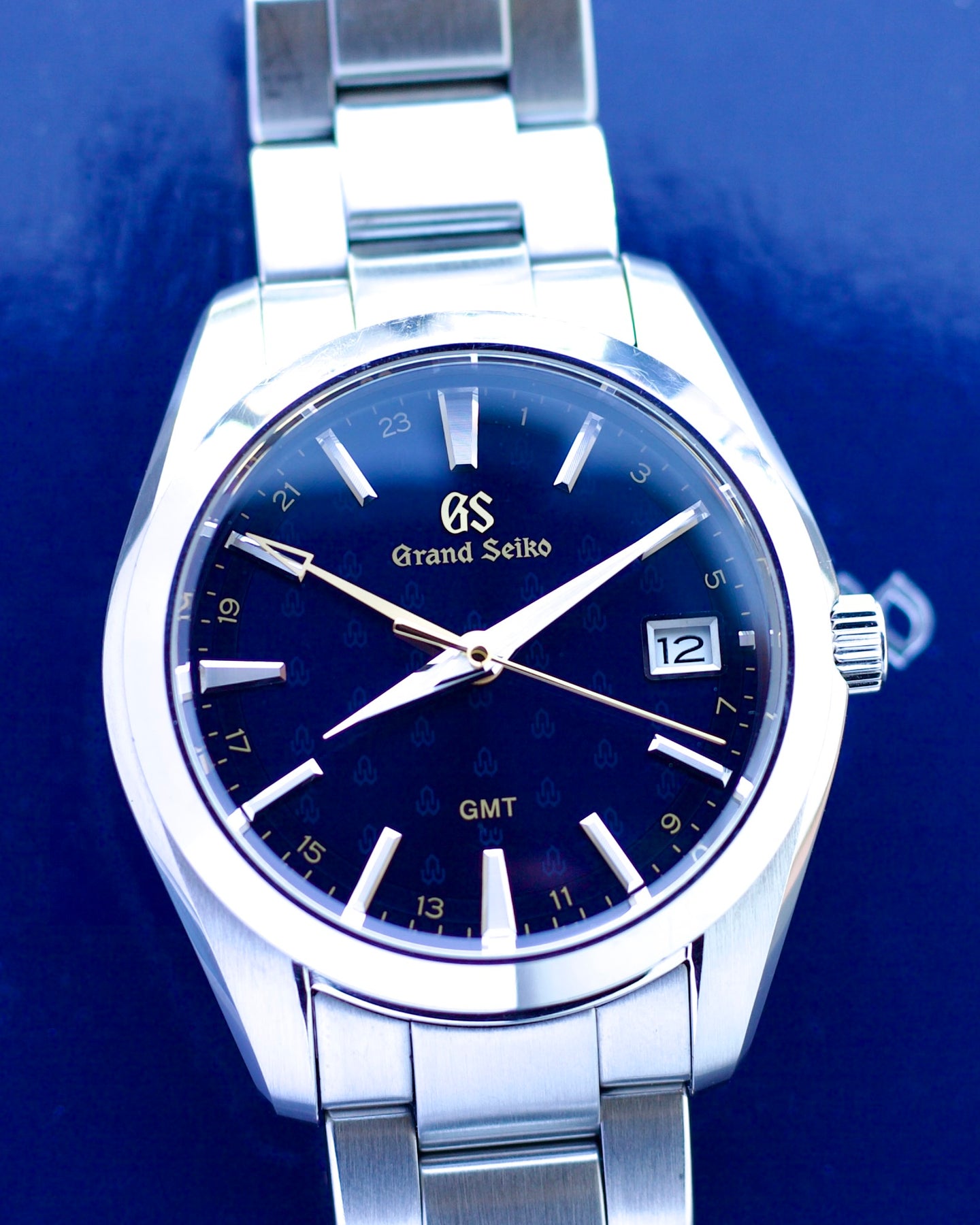 The seconds and GMT hands are in gold, as are the 24 hour numerals inside the minute track and the name Grand Seiko.