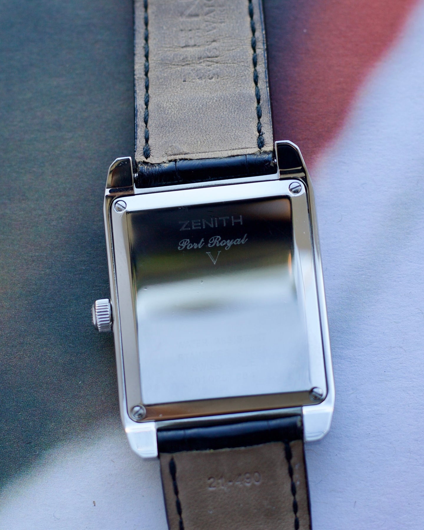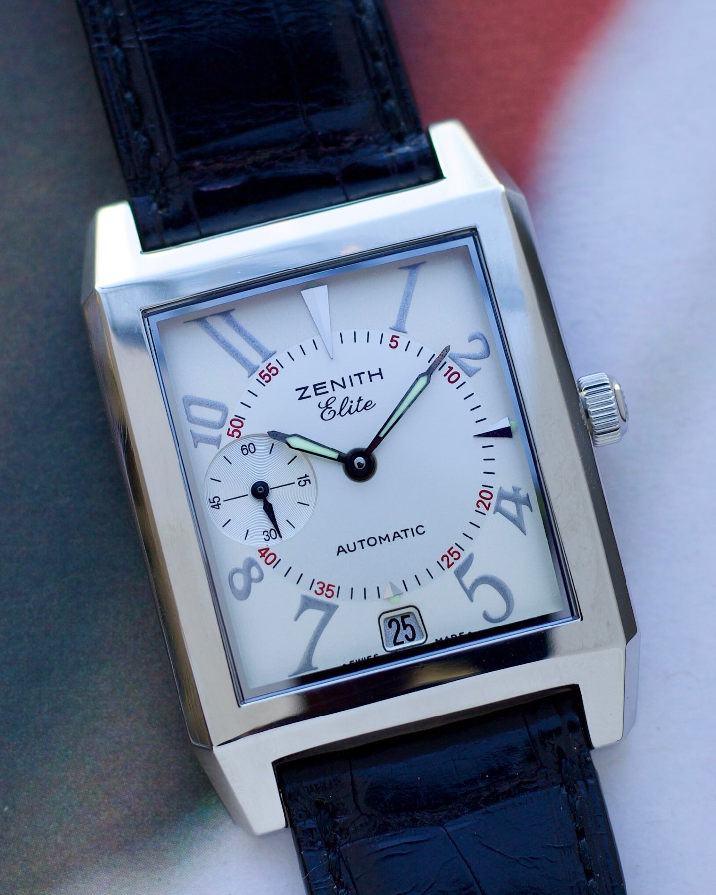 On Black Alligator handmade strap in good condition with Zenith signed pin buckle.